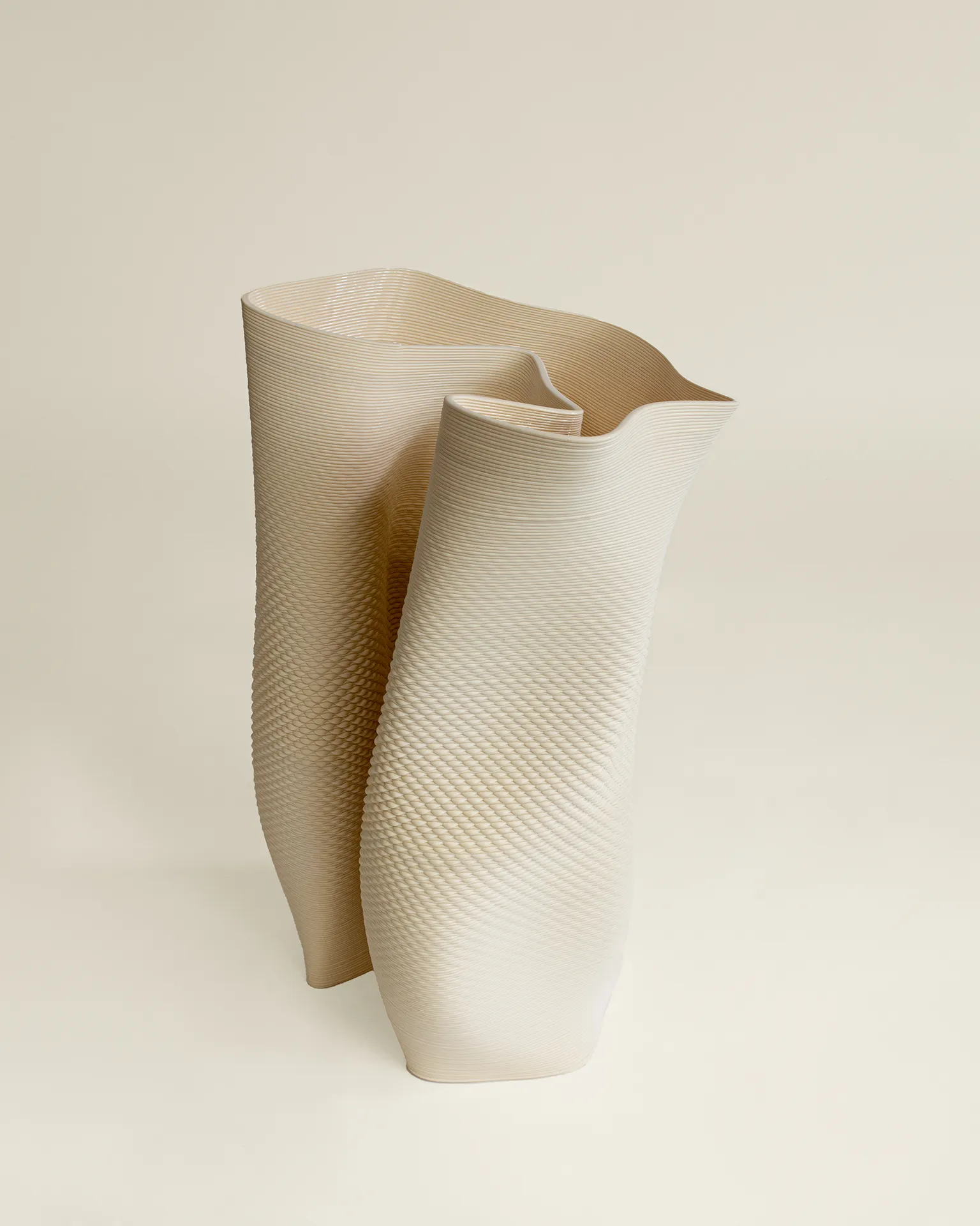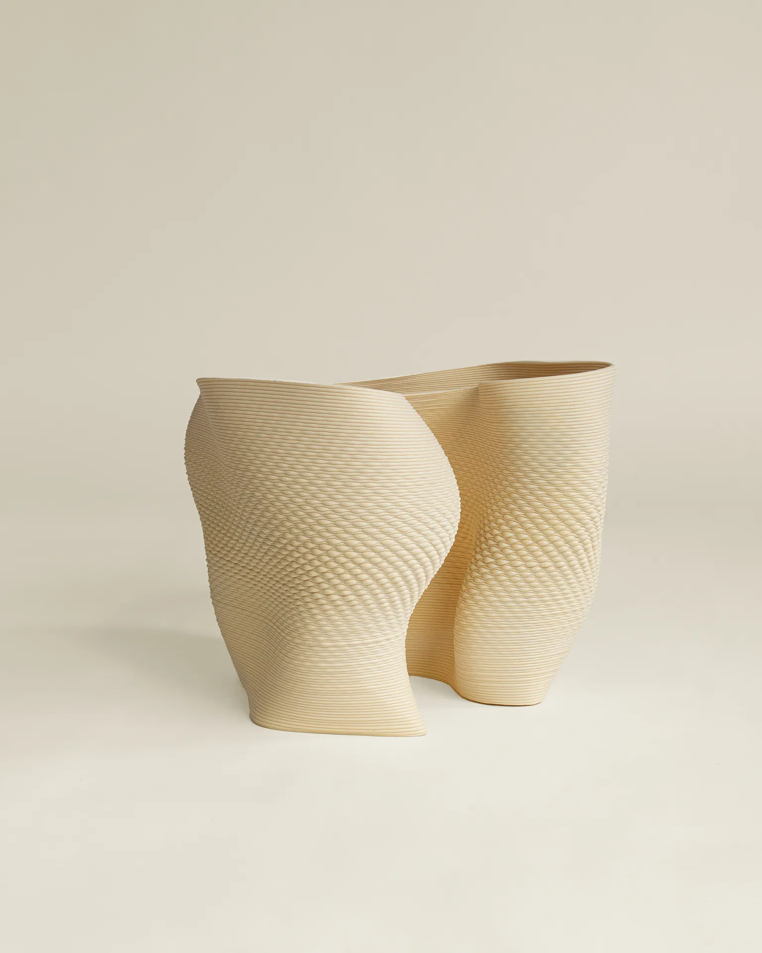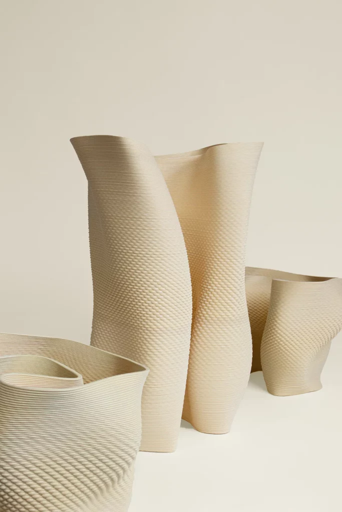 Studer & Co has developed a collection of 3D-printed vases that can be produced in any RAL shade. The organic shapes and textured surfaces introduce a dynamic, tactile quality to interiors. Each piece is fabricated using robotic 3D printing, with speed and extrusion constantly recalibrated to sculpt the material into fluid, site-specific forms.